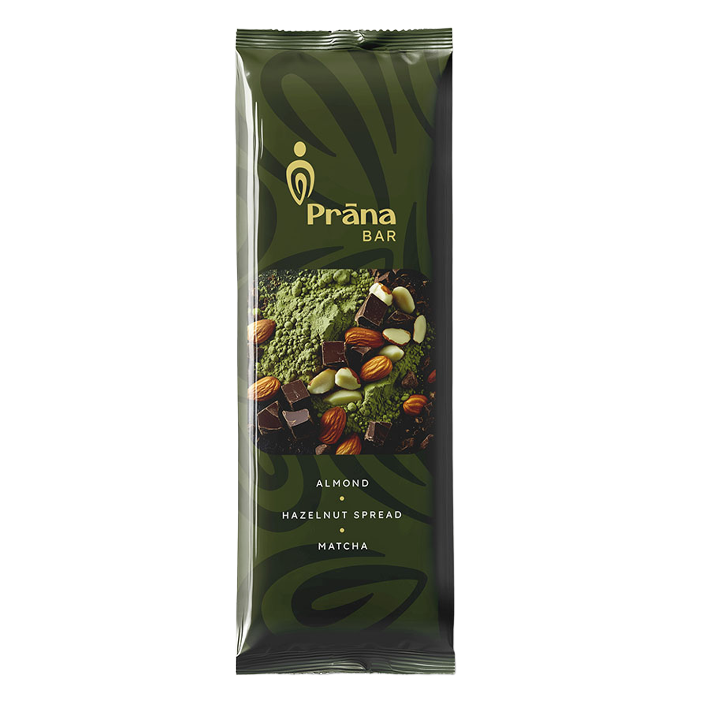 A Prana Mandulás–Mogyorókrémes Matcha Szelet harmonikusan ötvözi a mandula és a mogyorókrém lágy, telt ízét a matcha karakteres, enyhén zöld teás aromájával.